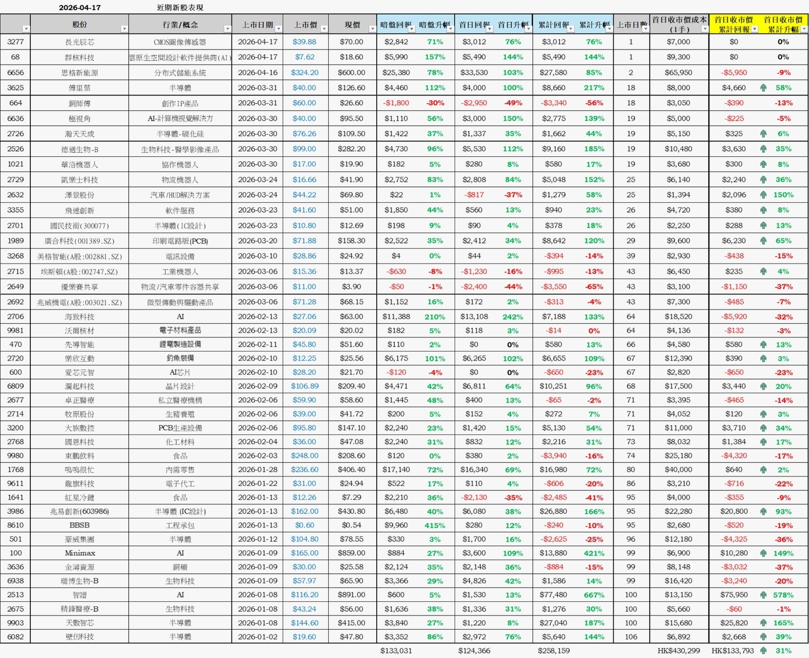 2026年新股表現一覽表